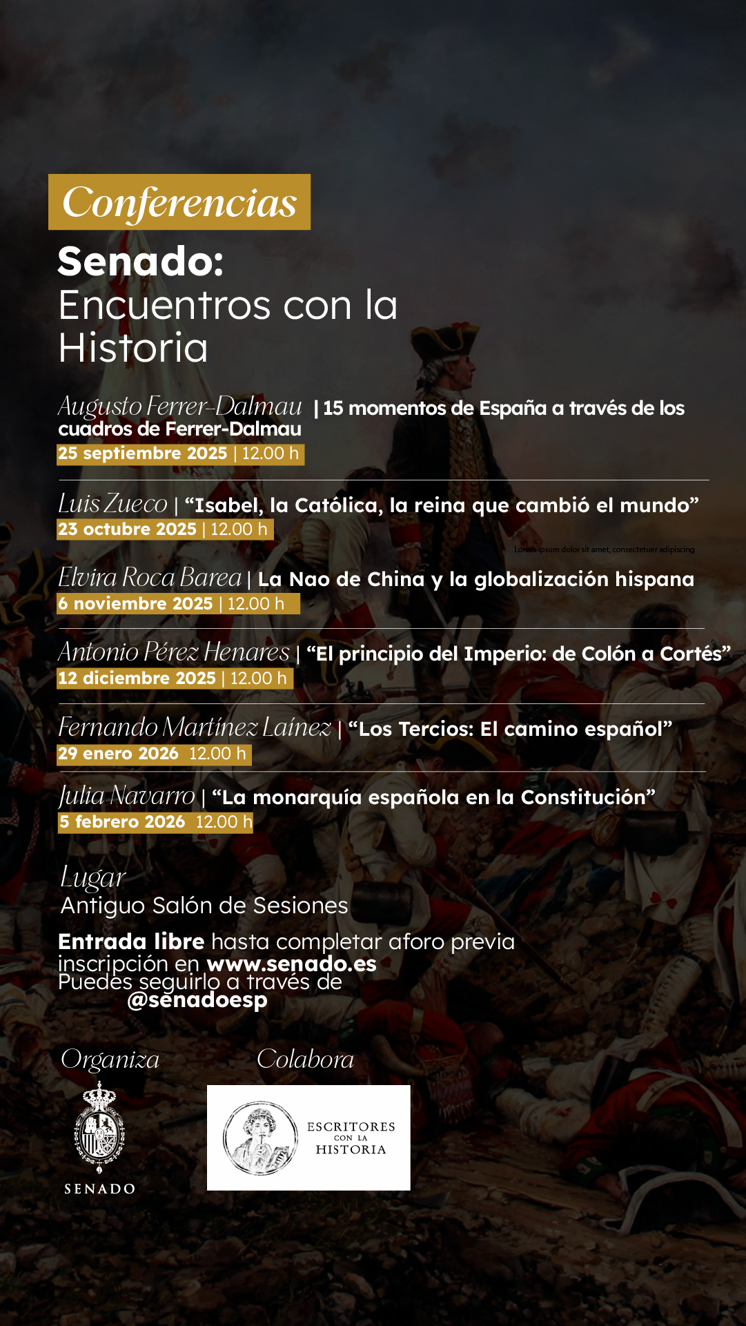 Este ciclo de conferencias se celebrará entre septiembre de 2025 y febrero de 2026 en el Antiguo Salón de Sesiones del Palacio del Senado. El programa incluye seis conferencias que estarán abiertas al público previa inscripción, con 10 días de antelación a la celebración de la conferencia, hasta completar aforo en la web del Senado.