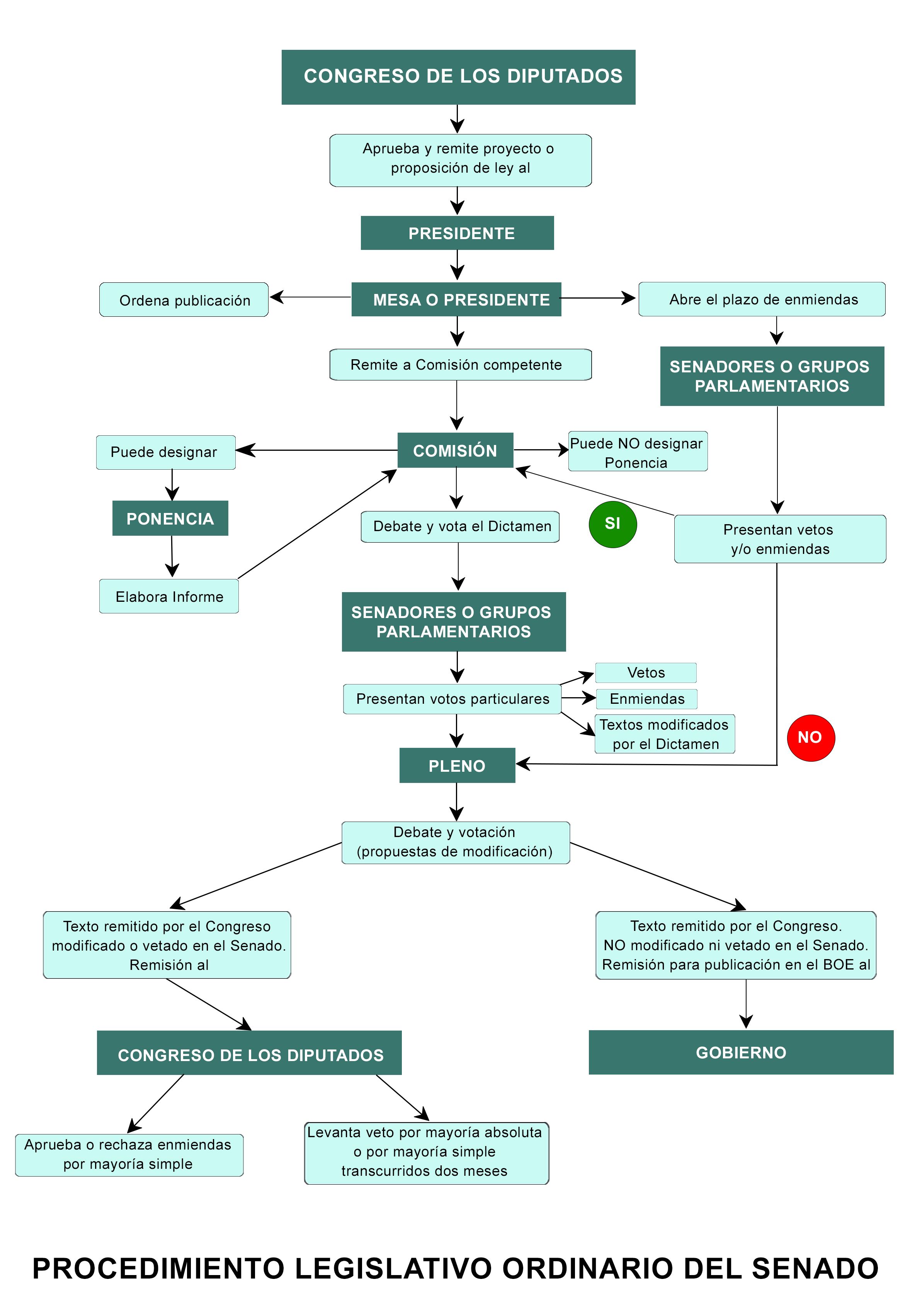 En el Senado se sigue un procedimiento parecido, pero siempre limitado por el plazo de dos meses que establece la Constitución y que se acorta a tan solo veinte días en los proyectos declarados urgentes: