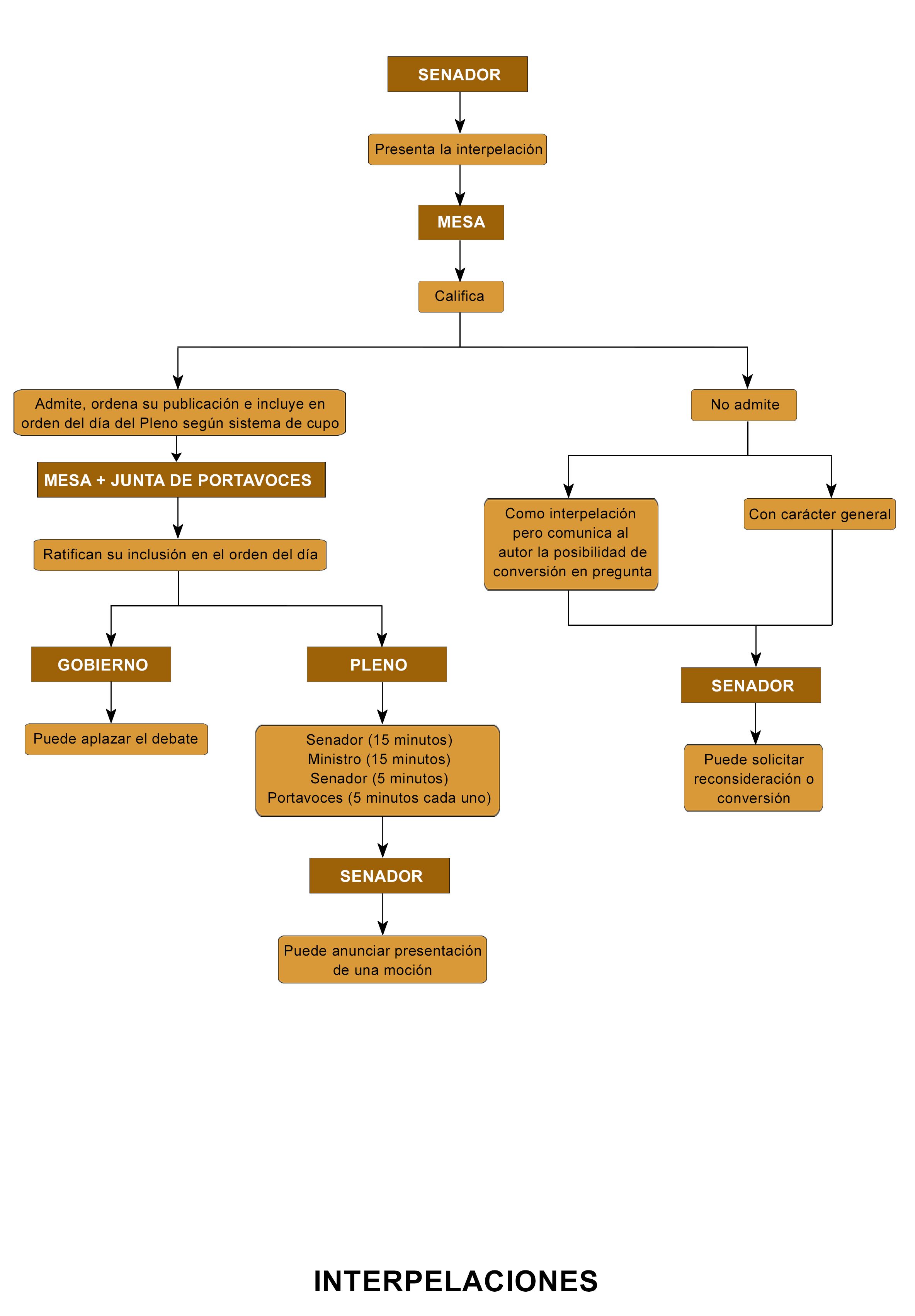 Las interpelaciones, que solo se sustancian ante el Pleno, se presentan, mediante escrito dirigido a la Presidencia del Senado, en el Registro General de la Cámara, hasta las catorce horas del lunes de la semana anterior a aquella en que vaya a celebrarse una sesión plenaria. La Mesa califica el escrito y, en caso de que su contenido no sea propio de una interpelación, lo comunica a su autor para su conversión en pregunta con respuesta oral o por escrito (artículo 170 del Reglamento del Senado).
