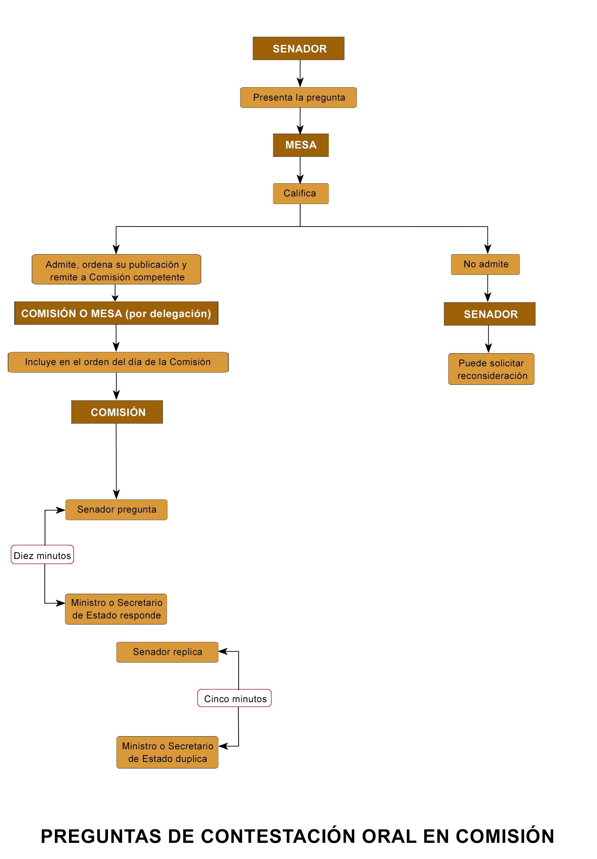 Las preguntas pueden ser de respuesta escrita o de respuesta oral, y esta producirse en el Pleno o en comisión. En defecto de indicación expresa, se entiende que quien formula una pregunta solicita respuesta por escrito, y si solicita respuesta oral y no especifica su voluntad de que se conteste en el Pleno, se entiende que la contestación ha de tener lugar en la comisión correspondiente (artículo 161 del Reglamento del Senado).