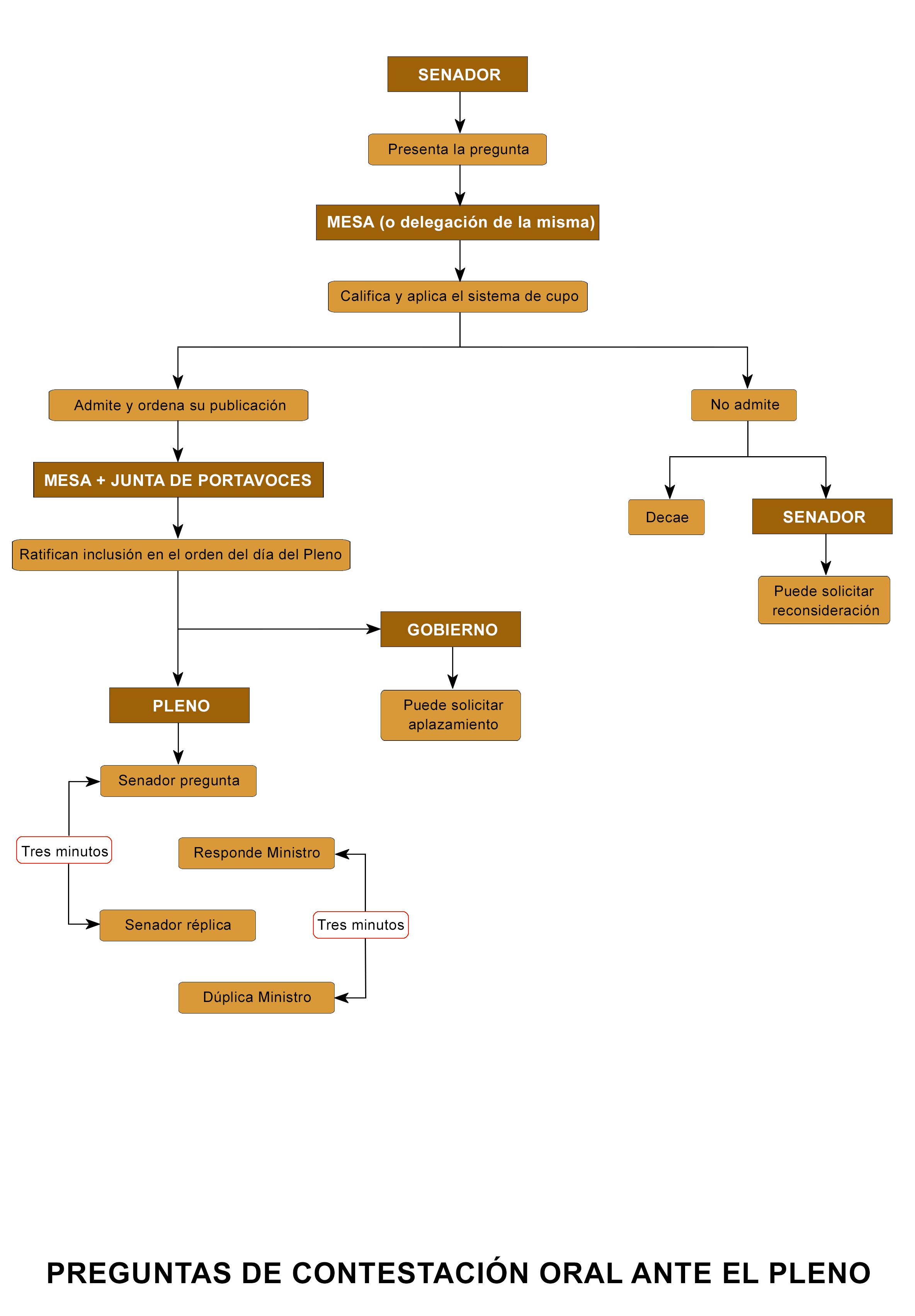 Se presentan en el Registro General del Senado entre el lunes y las doce horas del jueves de la semana anterior a aquella en que se celebre la sesión plenaria en que vayan a tramitarse. La Mesa califica el escrito y admite la pregunta si se ajusta a las previsiones reglamentarias. La inclusión de las preguntas en el orden del día se efectúa mediante la aplicación de un sistema de cupo para cada grupo parlamentario fijado al inicio de cada período de sesiones. Las preguntas no incluidas en el orden del día decaen. Cabe la posibilidad de sustituir las preguntas presentadas por otras relativas a asuntos acordados en el Consejo de Ministros o por cuestiones de especial urgencia o actualidad (artículo 163 del Reglamento del Senado y Norma supletoria de 23/5/01).