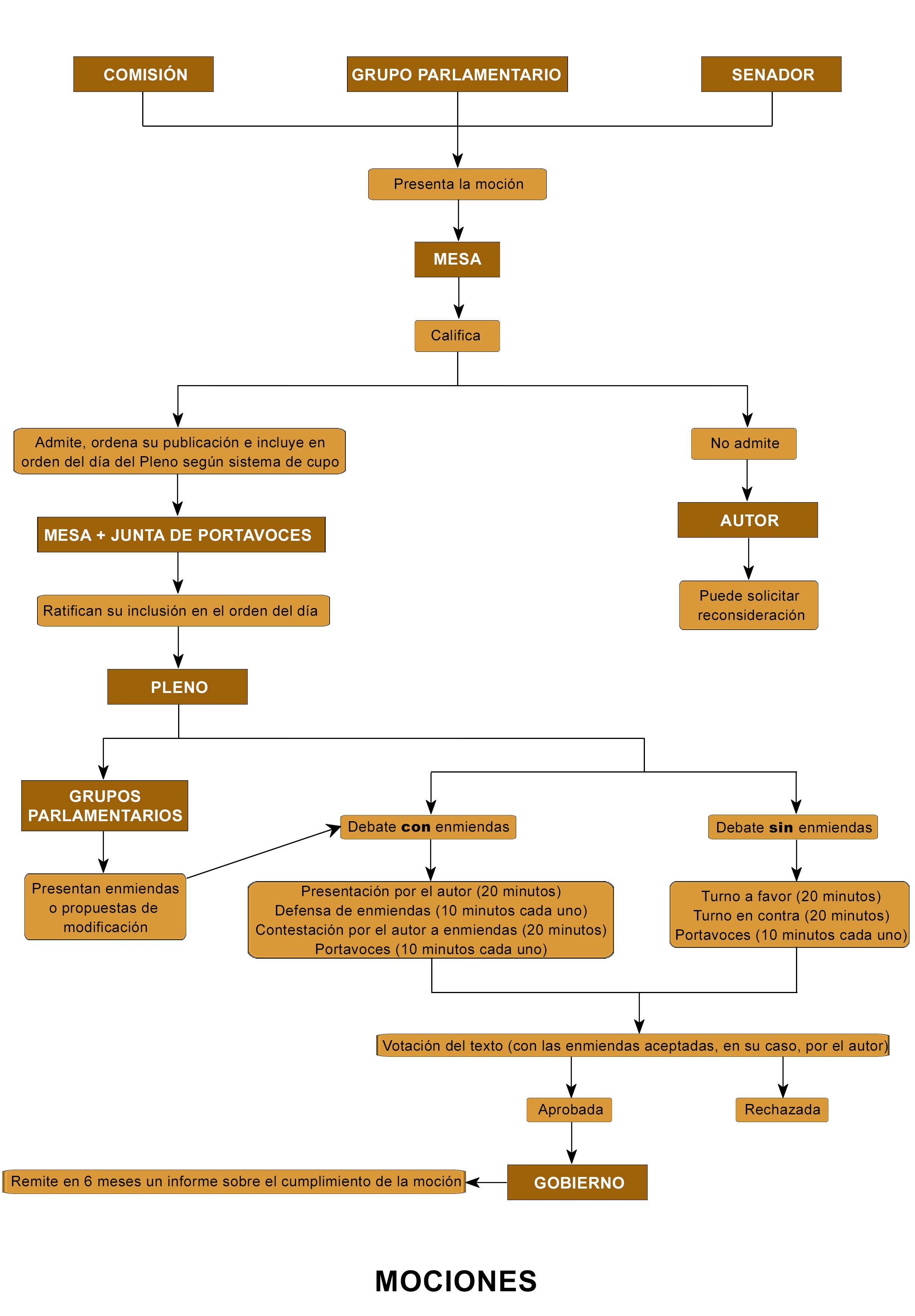 La tramitación de las mociones en el Pleno se ajusta a las siguientes fases: en primer lugar se abre un turno a favor por un tiempo de quince minutos según acuerdo de los portavoces. A continuación, intervienen los representantes de los grupos parlamentarios que hayan presentado enmiendas, los cuales disponen de un tiempo de diez minutos cada uno, pudiendo ser contestados por el firmante de la moción, por un tiempo de quince minutos. En todo caso, cabe un turno en contra de quince minutos. Concluidas las intervenciones anteriores, pueden tomar la palabra los portavoces de los grupos parlamentarios que lo soliciten, por un tiempo no superior a diez minutos cada uno. Concluido el debate, la moción, con las enmiendas aceptadas por el proponente de aquella, se somete a votación (artículo 176 del Reglamento del Senado y Norma supletoria de 30/11/93, modificada por las Normas de 21/3/95, de 9/4/2002 y de 24/2/2005).